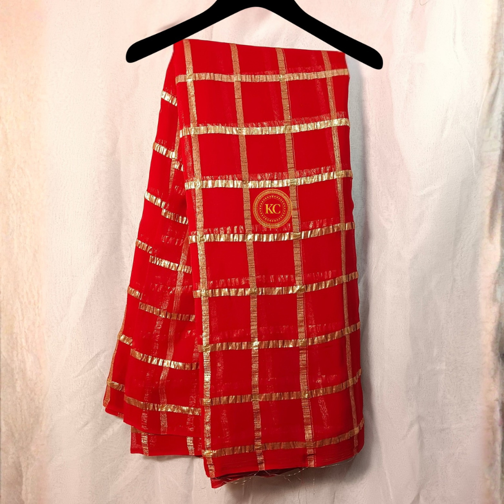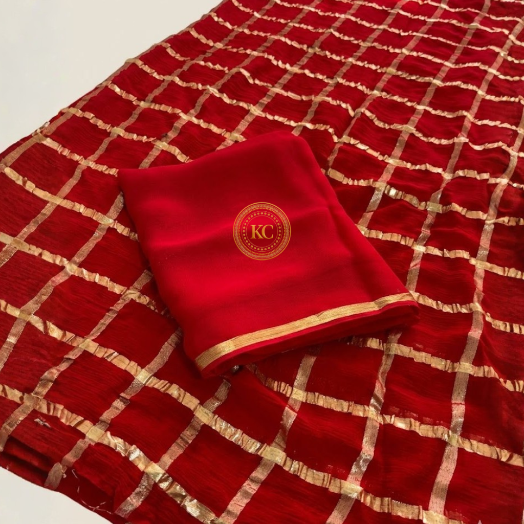 Dimensions Saree: 5.5 Meters | Blouse: 0.8 Meters (Matching Red)