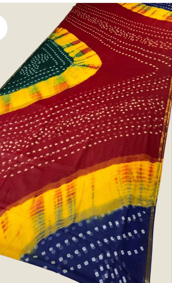 • Secondary Keywords: Pure Georgette Shibori, Zari Border Saree, Shibori Bandhani, Festive Saree, Designer Tie-Dye, Rainbow Saree.