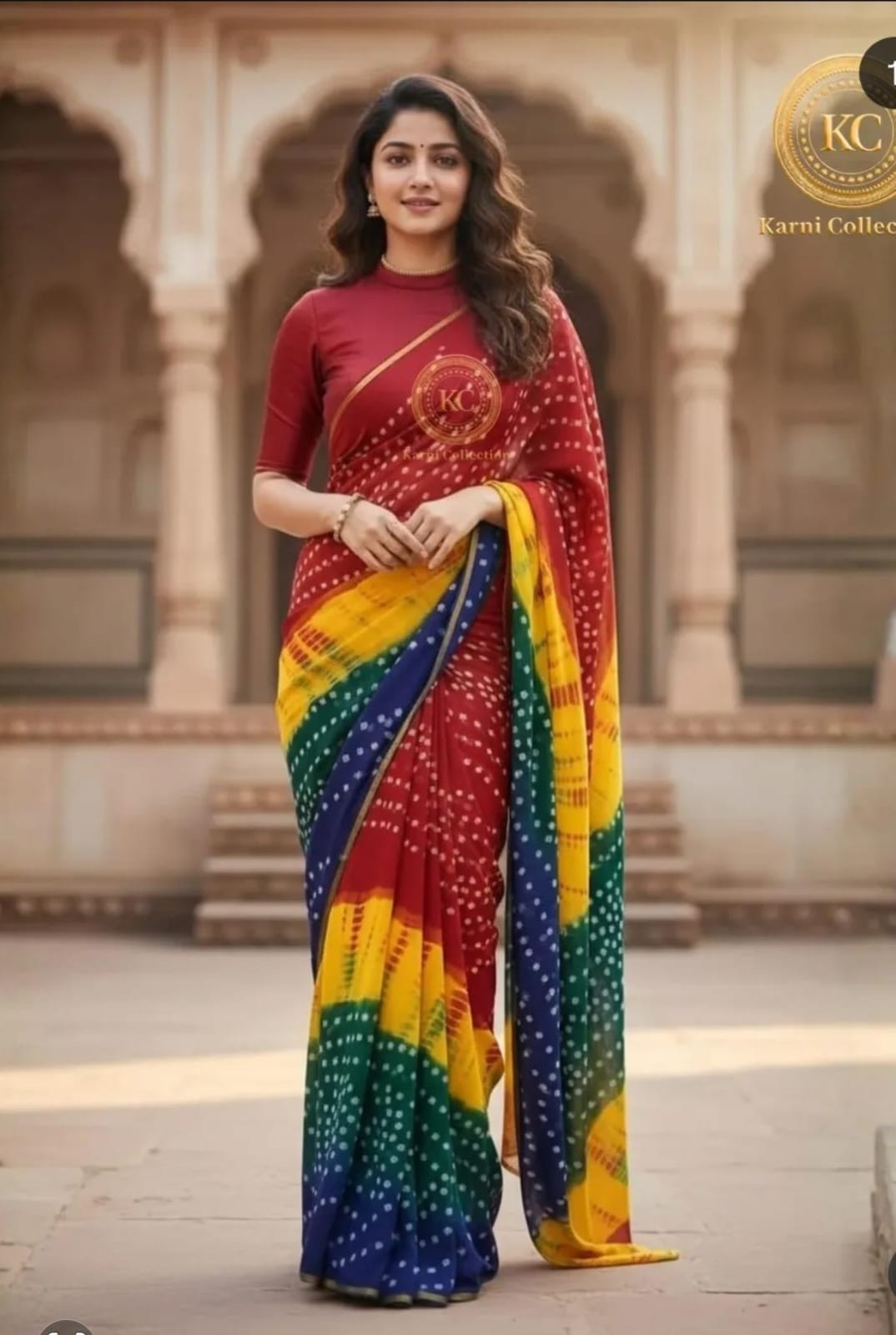 • Color Palette: A striking combination forms a stunning rainbow panel on the pallu (draping end). This includes auspicious Red, joyful Yellow, deep Blue, and vibrant Green. Meanwhile, the main body of the saree features a classic red hue dotted with contrast Bandhani work. Overall, this stunning mix ensures maximum visual impact.